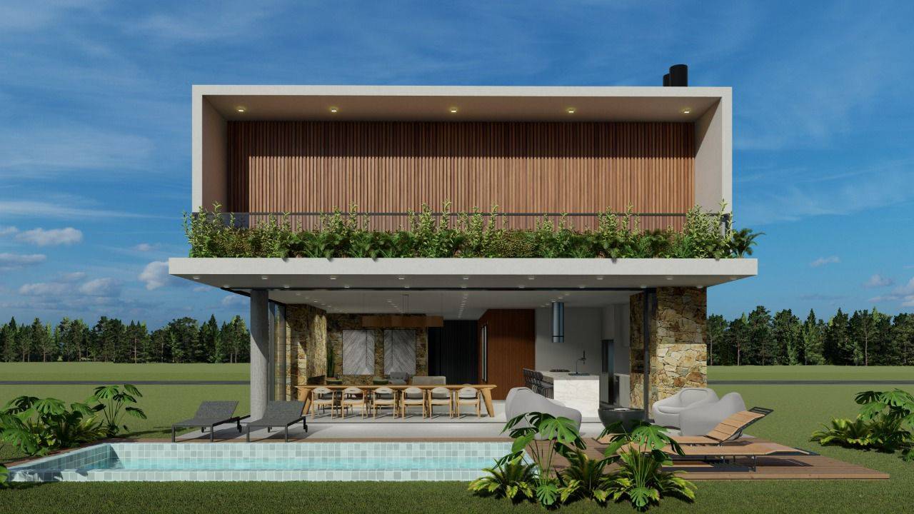 Sobrado na beira do lago, com altíssimo padrão de acabamento, fachada com pedras naturais e ripados de madeira, composto por 5 amplas suítes, living em 3 ambientes com lareira, lavabo, espera para elevador, espaço par arome office, estar superior, espaço gourmet com churrasqueira, lavadeira, depósito, dependência de empregada completa e piscina em concreto.
